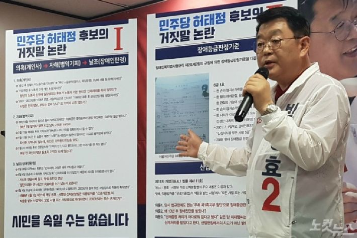 대전시 동구 판암동에 사는 시민 맹모(58) 씨는 5일 박성효 자유한국당 대전시장 후보 선거사무소에서 "(저는) 공사장에서 다쳐 발가락 4개가 없음에도 장애 등록을 두 차례나 거부당했는데 단 한 개의 발가락으로 허태정 후보가 어떻게 6급 1호에 해당하는 장애 등록을 받았는지 이해할 수가 없다"며 "정확한 해명이 필요하다"고 말했다.