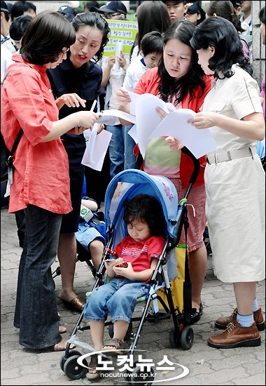 [BestNocut_R]촛불집회를 주도한 혐의로 경찰 수사를 받고 있는 ''유모차부대'' 카페 주부들이 22일 오전 서울 종로구 서울지방경찰청 앞에서 연 표적 수사 규탄 기자회견에 앞서 의견을 나누고 있다.