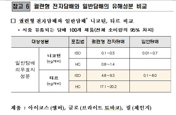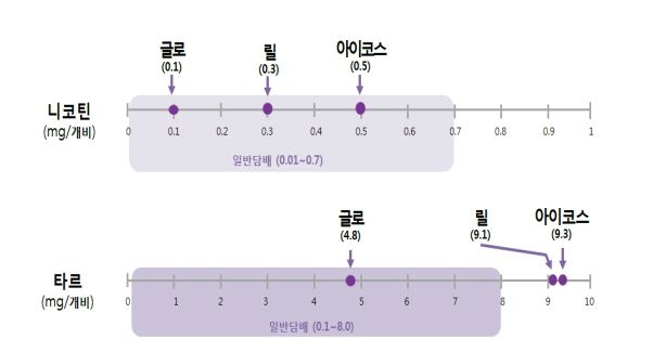 식약처가 평가한 궐련형 전자담배인 필립모리스의 '아이코스', BAT 코리아의 '글로', KT&G의 '릴' 등 3개 제품에 포함된 발암물질의 농도는 일반담배보다는 적은 수준이었다.