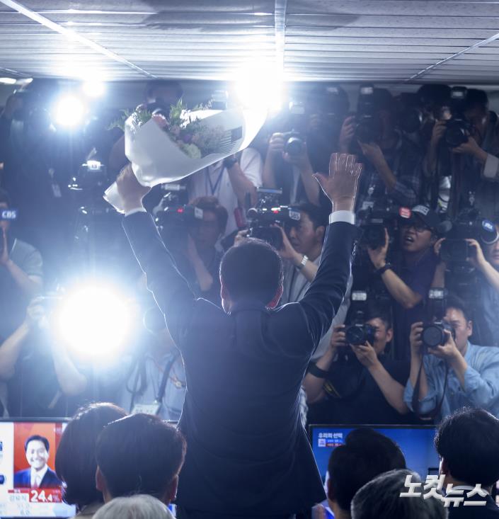 6.13지방선거 서울시장 선거에서 당선이 유력해지며 3선을 앞둔 더불어민주당 박원순 후보가 13일 오후 서울 안국동 선거캠프에서 꽃다발을 받고 손을 들어 보이고 있다.