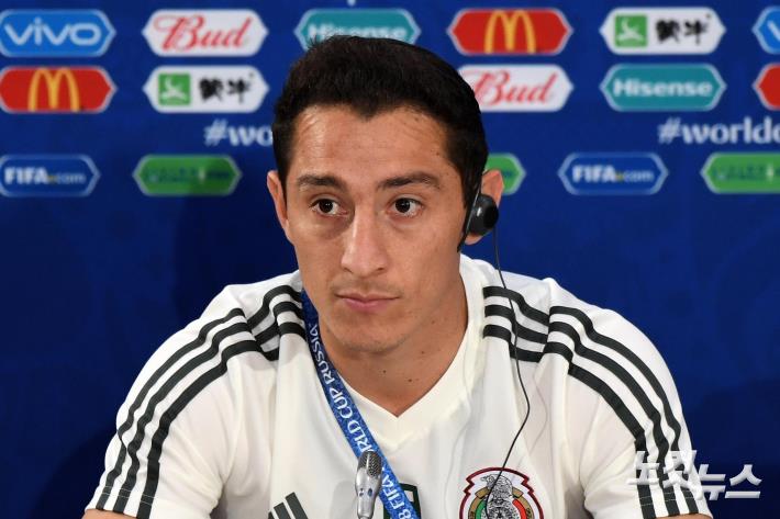 2018 러시아월드컵 조별리그 F조 대한민국과 멕시코의 경기를 하루 앞둔 22일(현지시간) 러시아 로스토프 아레나에서 멕시코 축구대표팀 주장 안드레스 과르다도가 기자회견을 하고 있다.
