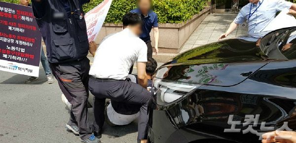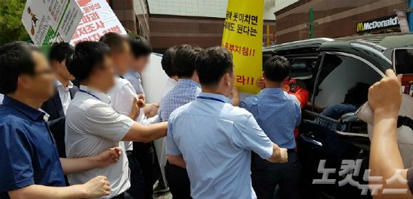 이에 경찰이 채증을 시작했고, 노조 측은 "준비해 온 정책 제안서를 받으라"고 요구하며 김 장관의 차량을 에워싸고 막아섰다.