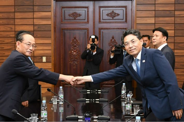 남북 도로협력분과회담 우리측 수석대표 김정렬 국토교통부 2차관(오른쪽)과 박호영 북한 국토환경보호성 부상이 28일 오전 판문점 북측 통일각에서 열린 남북 도로협력 분과회의 전체회의에 앞서 악수하고 있다. (통일부 제공)