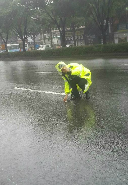 지난 3일 오후 2시쯤 부산 사상구 삼선병원 앞 도로에 시설물 침수 점검을 하던 부산 사상경찰서 주례지구대 소속 문해근 경사 눈 앞에 믿을 없는 광경이 벌어졌다.