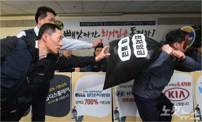 17일 오전 서울 중구 경향신문빌딩에서 열린 최저임금 도둑기업 발표 및 4.21 최저임금행진 계획 기자회견에서 최저임금대행진 준비위원회와 금속노조 관계자들이 퍼포먼스를 하고 있다. 이한형기자