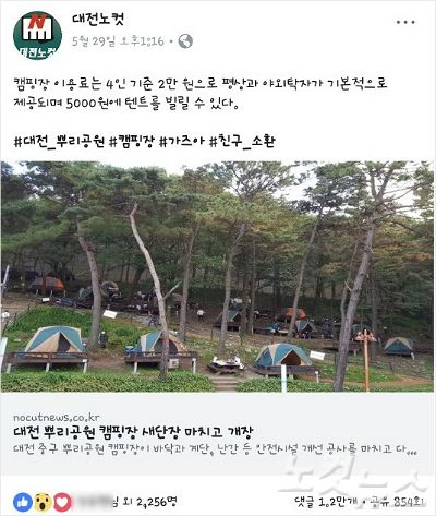 뿌리공원 캠핑장 재개장 소식을 알린 페이스북 대전노컷.