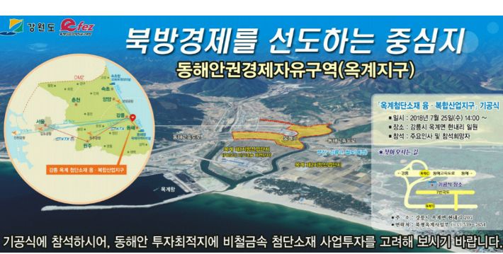 동해안권경제자유구역청은 오는 25일 강원 강릉시 옥계면 현내리 일원에서 최문순 강원지사와 각급 유관기관 단체장, 지역주민 등 200여 명이 참석한 가운데 옥계지구 개발사업 기공식을 개최한다.