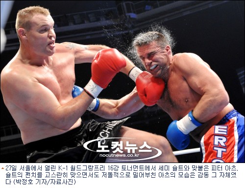 ''Mr. K-1'' 피터 아츠(38)는 지난 27일 K-1 월드그랑프리 16강 토너먼트에서 세미 슐트(35, 이상 네덜란드)를 판정으로 꺾었다. 그의 손이 올라가는 순간 아츠는 "야~" 탄성을 내지르며 두 팔을 번쩍 치켜들었다. 숨죽였던 관중석에선 환호성이 터졌다. 땀범벅이 된 노장 파이터의 얼굴엔 미소가 가득 번졌다.
