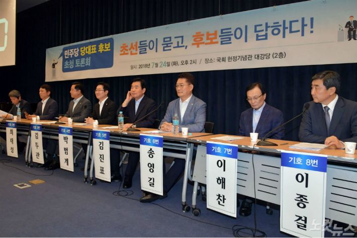 24일 오후 국회 헌정기념관에서 열린 더불어민주당 당 대표 후보 초청 토론회 '초선들이 묻고 , 후보들이 답한다!'에서 후보자들이 발언을 하고 있다.(좌측부터 이인영, 최재성, 김두돤, 박범계, 김진표, 송영길, 이해찬, 이종걸) (사진=윤창원 기자)