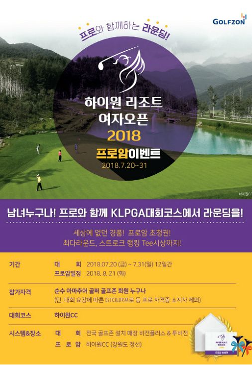 이번 이벤트는 골프존 회원 중 GTOUR 프로 등을 제외한 순수 아마추어 골퍼라면 누구나 참여할 수 있으며 전국 골프존 매장에서 회원 로그인 한 뒤 '하이원 리조트 여자오픈 2018 프로암' 대회 모드를 선택 후 18홀 라운드를 완료하면 된다.