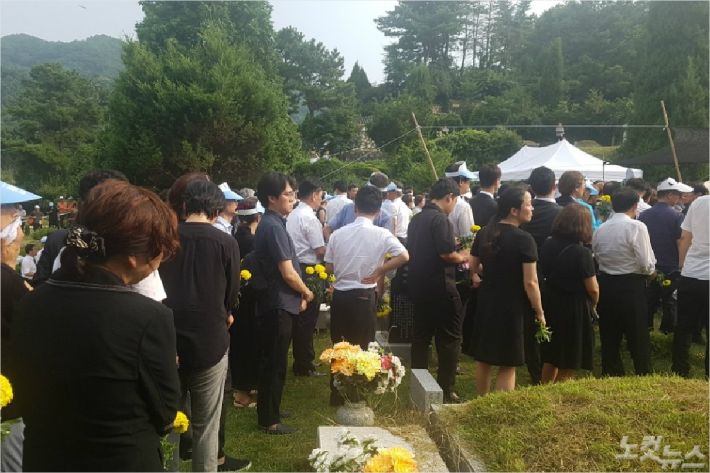 구성진 상여꾼들의 목소리와 함께 상여행렬이 들어왔고, 관이 안장되는 순간 더위에도 참석자들은 흔들던 부채를 멈추고 숙연해졌다. 곳곳에선 오열하는 소리가 터져나왔다. 하관식 내내 참석자들은 '임을 위한 행진곡'을 제창했다.