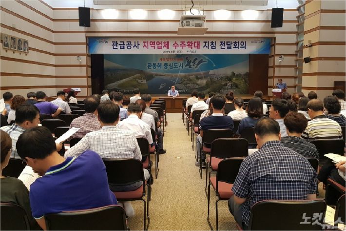 이날 회의에서 참석자들은 ▲관급공사 지역업체 계약 활성화 ▲관외업체 구매 최소화, 민간사업의 지역업체 적극 참여 ▲지역업체 수주확대 ▲관급자재 등 지역제품 설계반영 및 우선구매 ▲민간사업 지역업체 참여 추진을 위한 방침을 전달받았다.
