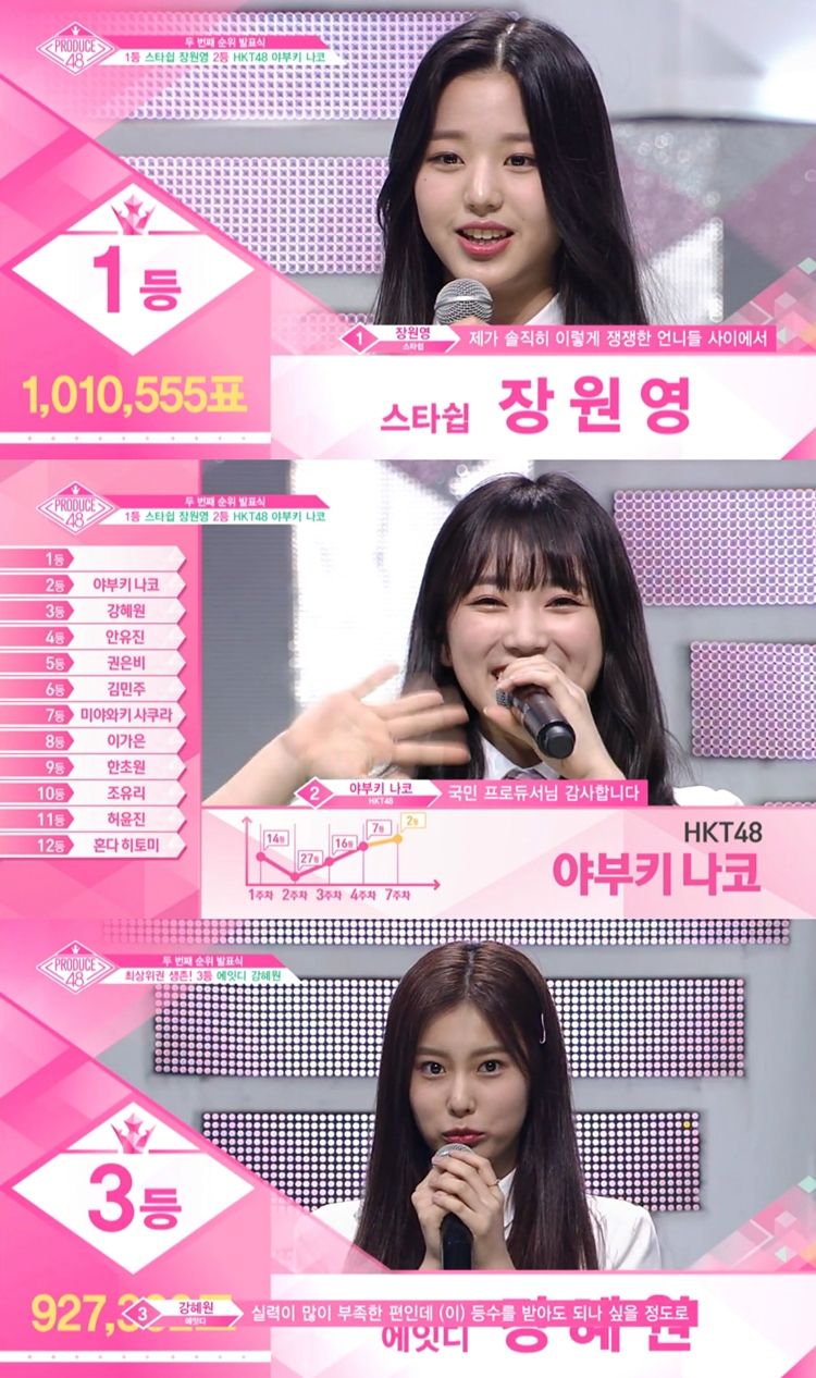 3일 방송된 Mnet '프로듀스48' 두 번째 순위 발표식에서 각각 1, 2, 3등을 차지한 장원영, 야부키 나코, 강혜원 (사진='프로듀스48' 캡처)