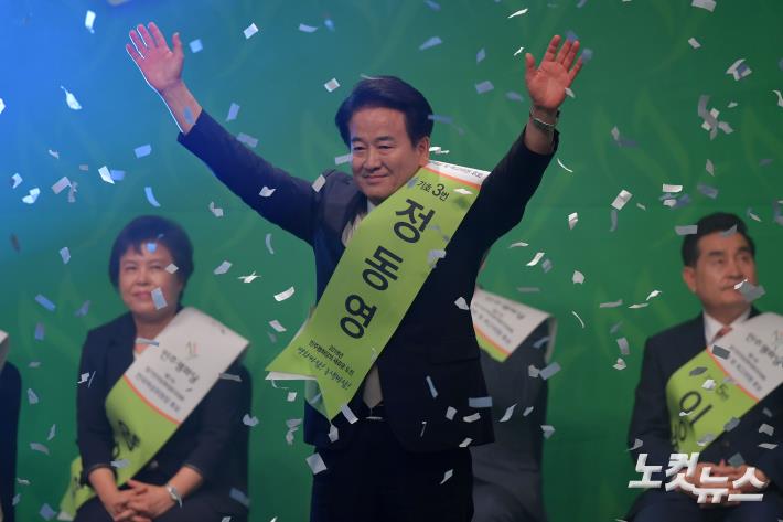 5일 서울 여의도 중소기업중앙화에서 열린 민주평화당 제1차 정기 전국당원대표자대회에서 새 당 대표에 선출된 정동영 의원이 손을 들어 환호에 답하고 있다.