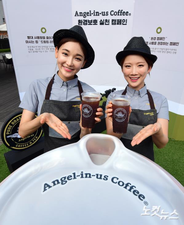 커피브랜드 엔제리너스가 8일 오전 서울 종로구 세종로TO점에서 국내 최초로 ‘드링킹 리드’를 선보이고 있다. ‘드링킹 리드’는 플라스틱 빨대를 사용하지 않고도 음료를 바로 마실 수 있는 뚜껑으로 오는 13일부터 순차적으로 전국 매장에 도입될 예정이다.