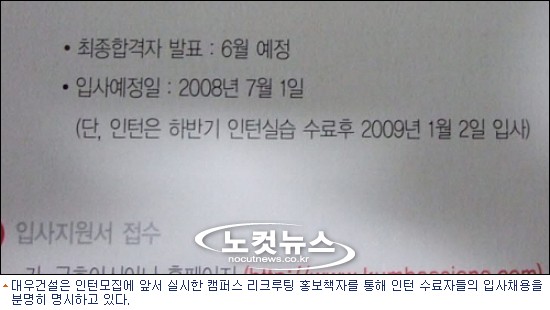 대우건설은 인턴모집에 앞서 실시한 캠퍼스 리크루팅 홍보책자에서 인턴 수료자들의 입사채용을 명시했다.