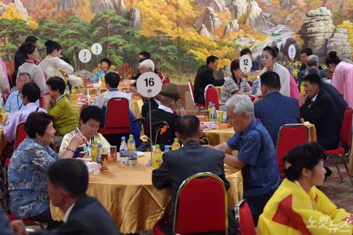어제(20일) 상봉 첫날에는 어색해하며 그냥 마주보며 앉았던 남북의 가족들은 개별상봉 시간에 많이 친해진 듯 섞여 앉아 담소를 나눴다. 북측 가족들의 표정과 움직임이 훨씬 자연스러워졌고 목소리도 커졌다. 서로 존대말을 하다가 나이순으로 반발도 하는 분위기로 바뀌었다.
