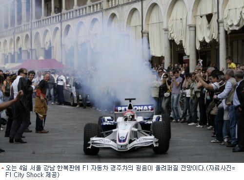 서울 도심 한복판이 세계 최고 경주장으로 깜짝 변신한다. 오는 4일 서울 강남구 삼성동 코엑스 사거리에 F1(포뮬러 원) 경주차가 등장한다.