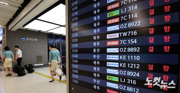 제19호 태풍 ‘솔릭’ 의 영향으로 23일 서울 강서구 김포공항 국내선 도착장 전광판에 항공편의 결항을 알리는 문구가 안내되고 있다.