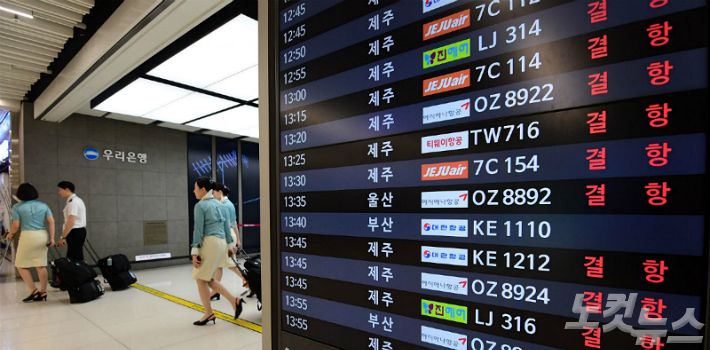 제19호 태풍 ‘솔릭’ 의 영향으로 지난 23일 서울 강서구 김포공항 국내선 도착장 전광판에 항공편의 결항을 알리는 문구가 안내됐다. (사진=황진환 기자/자료사진)