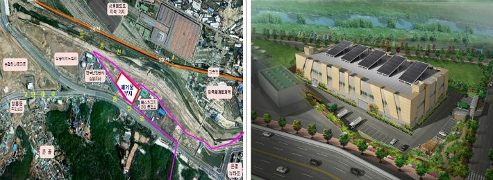은평 광역자원순환센터 조감도(오른쪽)와 위치도(왼쪽). (사진=자료 캡쳐)