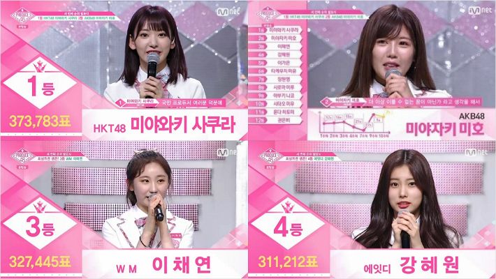 1등은 성실하고 열정적인 모습으로 꾸준히 탄탄한 지지를 쌓아온 미야와키 사쿠라가 차지했다. 사쿠라는 "국민 프로듀서님 덕분에 여기 설 수 있었다. 국민 프로듀서 여러분 마음에 벚꽃이 피었으면 좋겠다"며 자신의 이름인 '사쿠라(벚꽃)'를 활용한 한국어 인사말을 전했다.