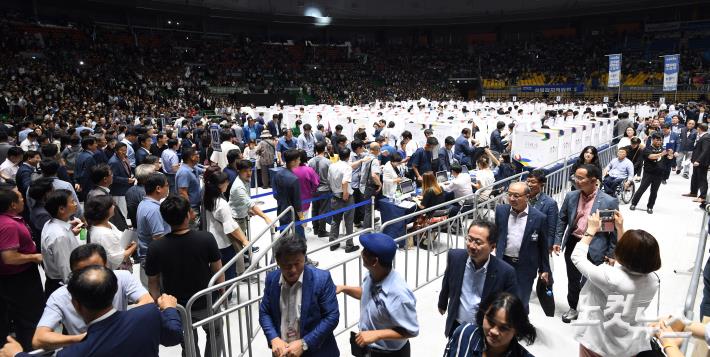 25일 오후 서울 송파구 올림픽공원 체조경기장에서 열린 ‘더불어민주당 제3차 정기전국대의원대회’ 에 참석한 대의원들이 당대표 및 최고위원 선출을 위한 투표를 하고 있다.