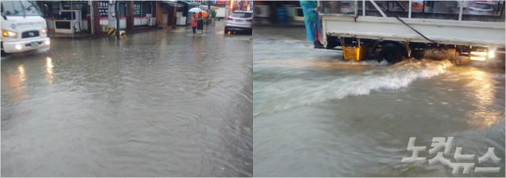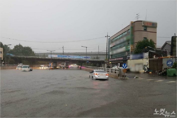 대전CBS 페이스북 페이지 '대전노컷'을 통해 독자들이 제보한 내용을 보면 대전 유성구 오토월드 인근 복용삼거리와 장대동 일부 상가, 대덕구 오정지하차도 등이 물에 잠겼다.