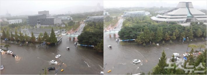 서구 대전평송청소년문화센터 앞 도로도 물이 가파르게 차오르면서 차량 통행에 불편을 겪고 있다.