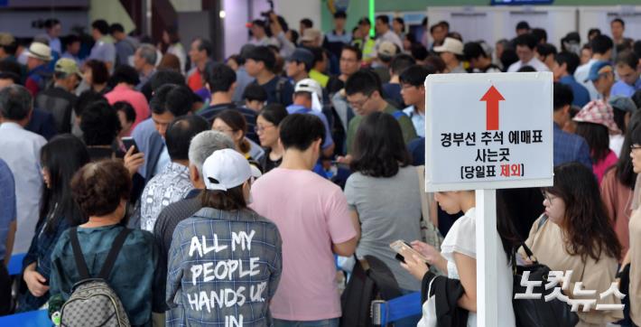 2018 추석 열차 승차권 예매 첫날인 28일 오전 서울역 매표소 앞에서 시민들이 추석 기차표를 구입하기 위해 줄 서 있다. 이날은 경부, 경전, 동해, 충북선 승차권을 29일은 호남, 전라, 장항, 중앙선 승차권을 예매할 수 있다. 승차권은 온라인 70%, 역과 판매 대리점에 30%가 배정되며, 스마트폰 등 모바일 기기에서도 승차권을 구입할 수 있다.