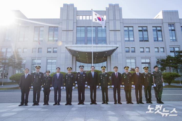 1일 오전 경기도 과천 군사안보지원사령부(옛 국군기무사령부)에서 열린 제막식에서 송영무 국방부 장관(가운데)이 남영신 초대 군사안보지원사령관(오른쪽 여섯번째)등 배석자들과 기념촬영을 하고 있다. 군사안보지원사령부는 국방부 직할 부대로 2900명 규모로 보안, 방첩에 중점을 두고 있다.
