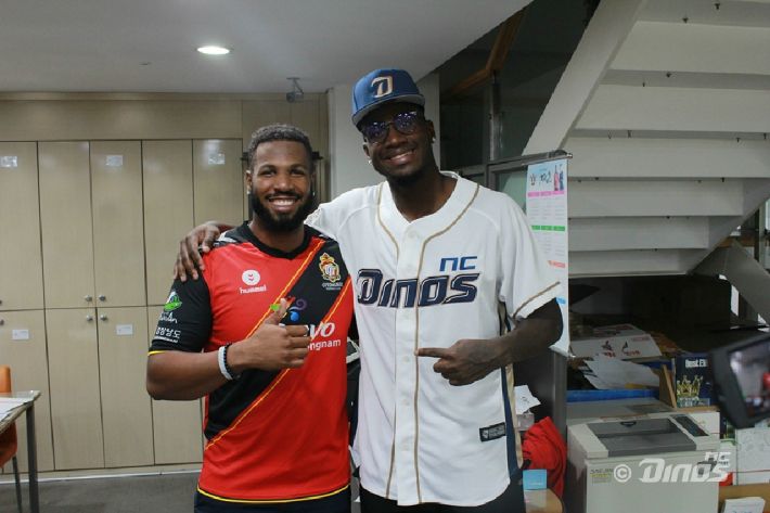 경남FC말컹과 NC다이노스 스크럭스가 서로 유니폼을 바꿔 입고 응원하고 있다. (사진=NC다이노스 제공)