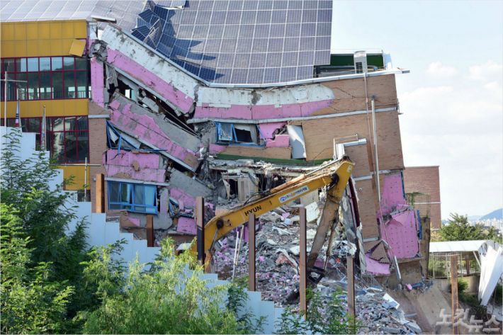한편, 구청은 이날 오후 압쇄기(붐 크러셔)를 이용해 유치원 건물의 기울어진 부분에 대해 우선 철거에 들어갔다.