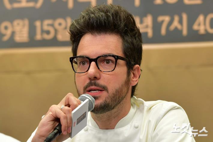 11일 서울 상암동 스탠포드호텔에서 열린 올리브 '한식대첩-고수외전' 기자간담회에서 이탈리아 파브리치오 페라리가 인사말을 하고 있다.