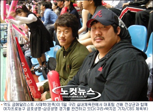 베이징올림픽 역도 금메달리스트 사재혁이 5일 구리 실내체육관에서 열린 구리 금호생명과 용인 삼성생명의 2008-2009 여자프로농구 정규리그 첫 경기에 시투자로 나섰다.