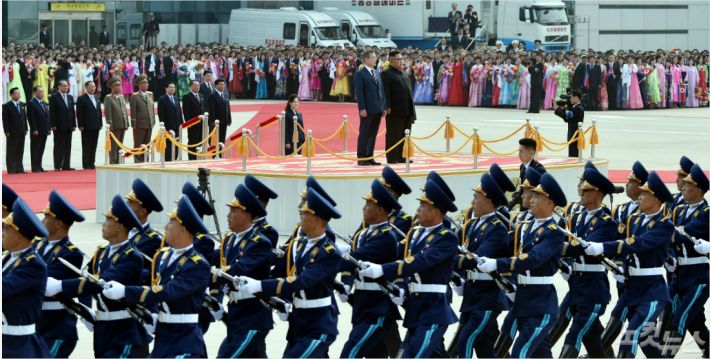 2018남북정상회담 첫날인 18일 평양 순안공항에 도착한 문재인 대통령이 마중 나온 김정은 국무위원장과 함께 사열을 받고 있다. 평양사진공동취재단