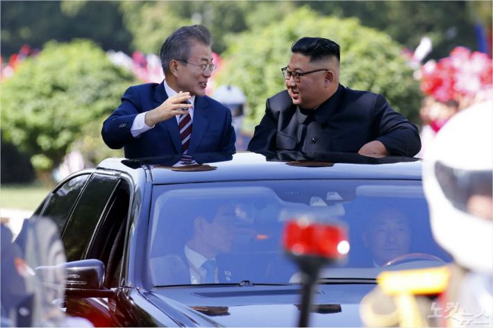 문재인 대통령과 김정은 국무위원장이 무개차를 함께 타고 18일 평양국제공항에서 백화원 초대소로 이동하고 있다. 평양사진공동취재단