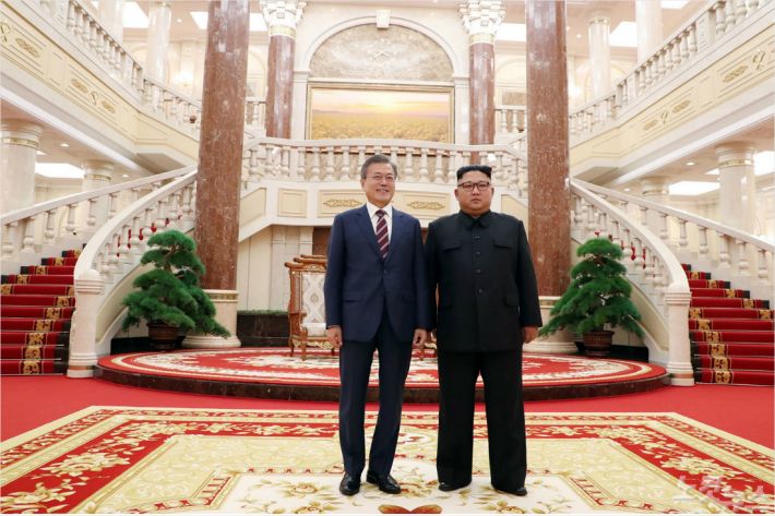 문재인 대통령이 18일 오후 평양 조선노동당 중앙위원회 본부 청사 로비에서 김정은 국무위원장과 정상회담 시작에 전 기념촬영을 하고 있다평양사진공동취재단