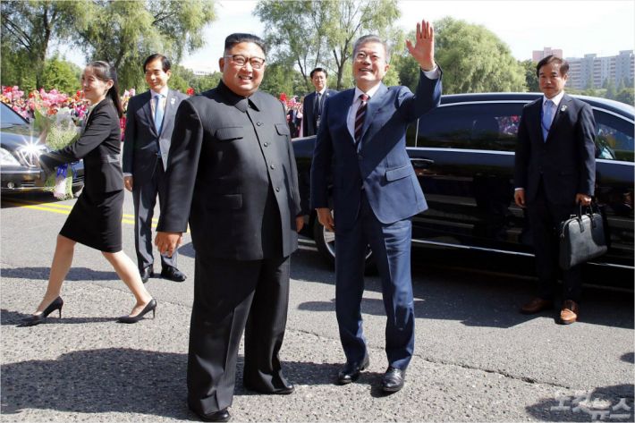 문재인 대통령과 김정은 국무위원장이 무개차를 함께 타고 18일 평양국제공항에서 백화원 초대소에 도착해 시민들에게 인사를 하고 있다. (사진=평양사진공동취재단)