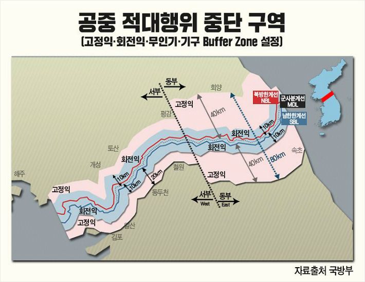 또 고정익항공기는 군사분계선으로부터 동부전선은 40㎞, 서부전선은 20㎞를 적용해 비행금지구역으로 설정하기로 했다.