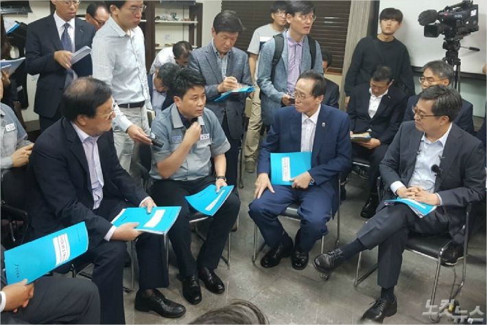 김동연 경제부총리(오른쪽 첫번째)가 19일 송하진 전북도지사(오른쪽 두번째)와 함께 군산에 위치한 '창원금속공업'을 찾아 협력업체 관계자들로부터 애로사항과 건의사항을 듣고 있다. (사진=이균형 기자)