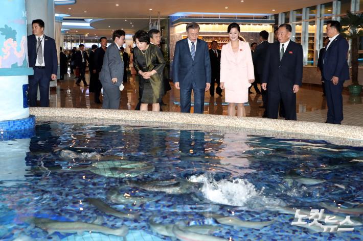 문재인 대통령과 김정숙 여사가 19일 오후 평양 대동강 수산물 식당에서 수조를 둘러보고 있다.