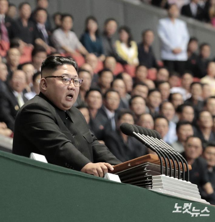 김정은 국무위원장이 19일 밤 평양 5.1 경기장에서 열린 '빛나는 조국'을 관람한 뒤 평양 시민들앞에서 연설을 하고 있다.