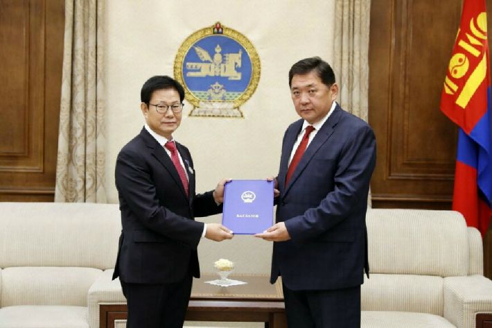 안경모 경희대 교수(왼쪽)가 21일 미 엥흐벌드 몽골 국회의장(오른쪽)으로부터 '몽골 우호 훈장'을 수여 받고 있다.
