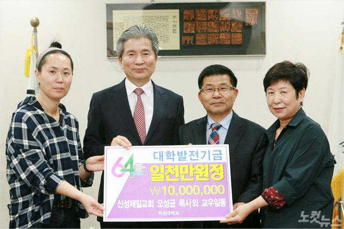 대전 신성제일교회 오성균 담임목와 여선교회 임원들이 27일 오전 11시 목원대 총장실을 방문해 권혁대 총장에게 대학발전기금 천만 원을 전달했다.