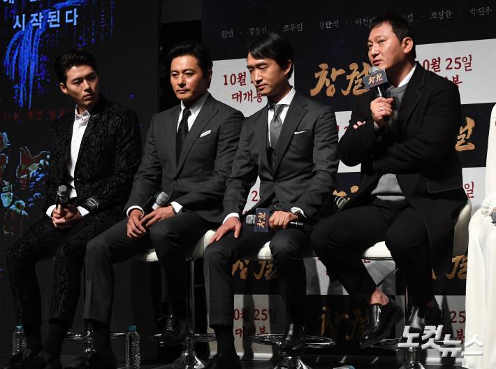 배우 정만식(오른쪽)이 28일 오전 서울 압구정CGV에서 열린 영화 ‘창궐’ 제작보고회에 참석해 취재진의 질문에 답하고 있다.