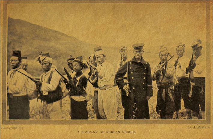 1907년 영국인 종군기자 맥켄지가 양평군 지평 인근에서 촬영한 의병대 모습: (1908년에 뉴욕에서 발간 된 책) p207, 사진: 맥캔지(F. A. McKenzie) / 자료 출처: 위키미디어