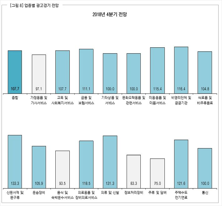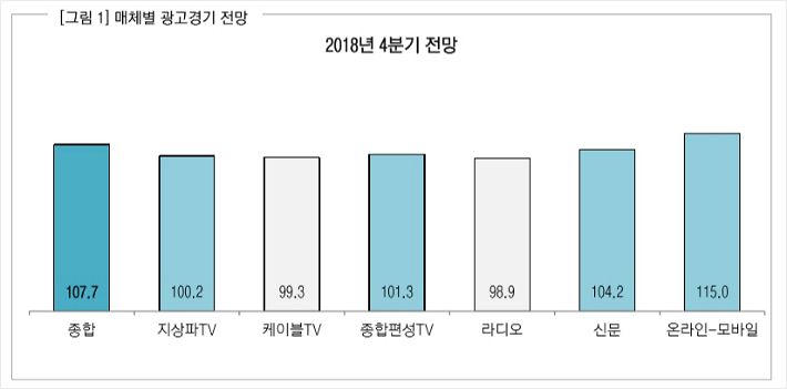 한국방송광고진흥공사(코바코, 사장 김기만)가 국내 광고시장의 경기변동을 파악하기 위해 매월 조사, 발표하고 있는 '광고경기전망지수'(KAI ; Korea AdvertisingIndex)에 따르면 2018년 4분기 종합 KAI는 107.7이 나왔다.