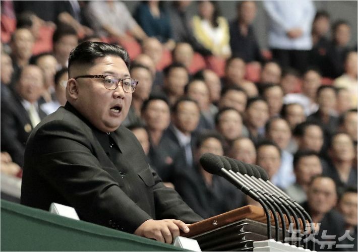 김정은 국무위원장이 지난 9월 19일 밤 평양 5.1 경기장에서 열린 '빛나는 조국'을 관람한 뒤 평양 시민들앞에서 연설을 하고 있다. (평양사진공동취재단)