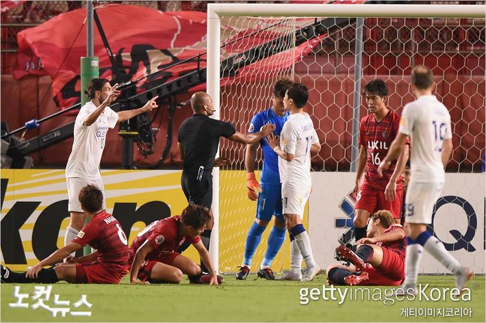 가시마 앤틀러스의 골키퍼 권순태는 주심이 보는 앞에서 수원 삼성 공격수 임상협과 언쟁을 벌이다 상대 얼굴을 머리로 들이박는 과격한 행동을 시도해 경고를 받았다.(사진=노컷뉴스/Gettyimages)